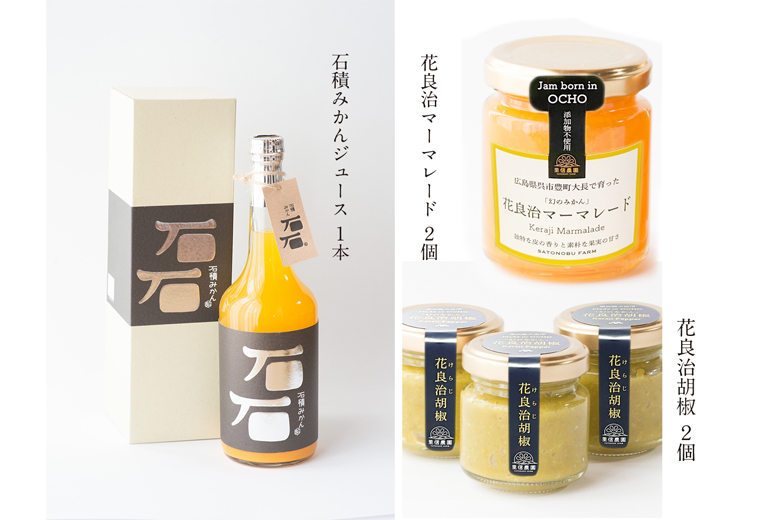 石積みかんジュース、花良治マーマレード2個、花良治胡椒2個のおすすめセット。おすすめの商品をセットにしました。